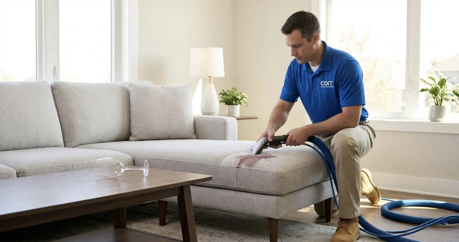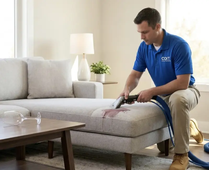 "A guest spilled an entire glass of Merlot on our cream-colored loveseat during a dinner party. I thought it was ruined -- the stain had soaked through. COIT's technician came out, applied a specialized wine stain treatment, and extracted every trace of it. The cushion looks completely untouched."